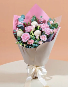 Pink Avalanche Rose (4 Stalks), White Ping Pong (3 Stalks), Light Pink Carnation Spray (4 Stalks), Cinerea Eucalyptus