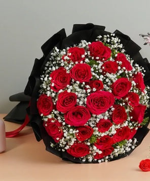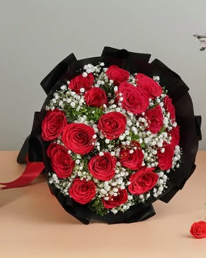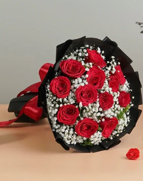 Red roses complemented by fine Baby Breaths (Gypsophila) make this bouquet an absolute stunner! Elegantly wrapped, this bouquet is perfect for romantic occasions, birthdays, or anniversaries as it represents your love and tenderness well. A bouquet that speaks for you!