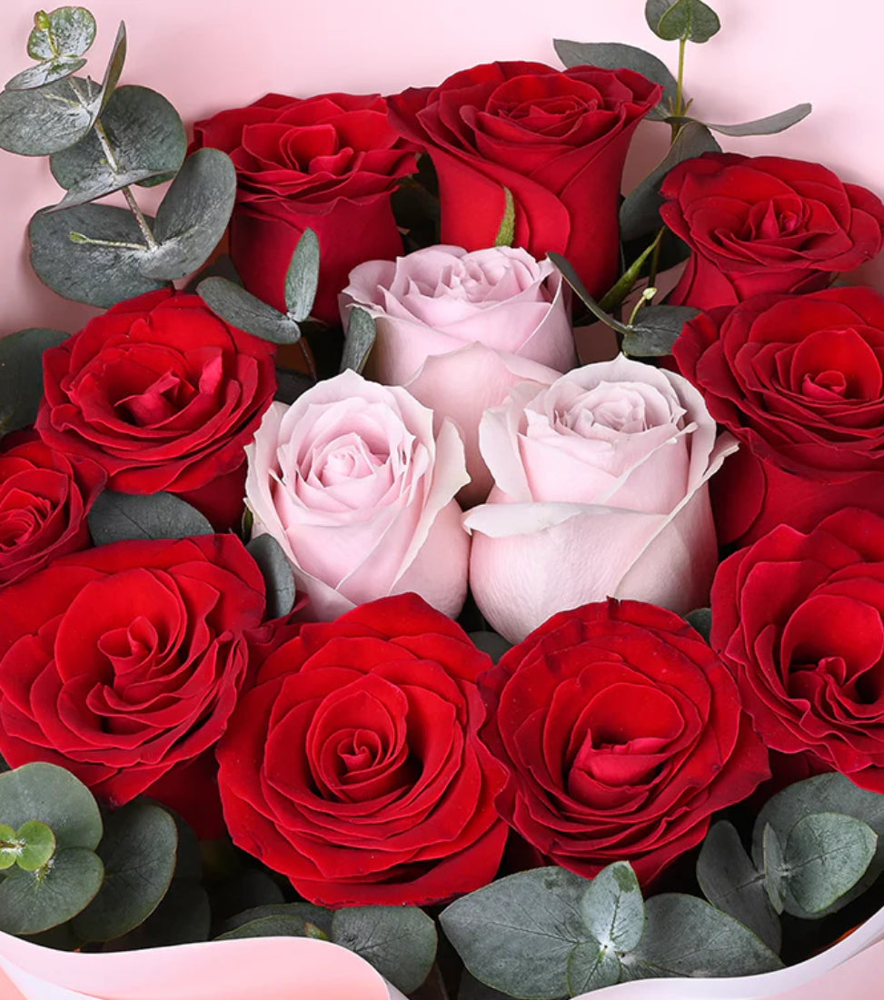 Light Pink Rose (3 Stalks), Red Rose (10 Stalks), Eucalyptus Leaves