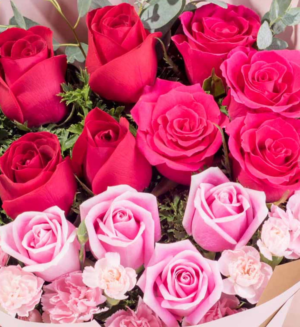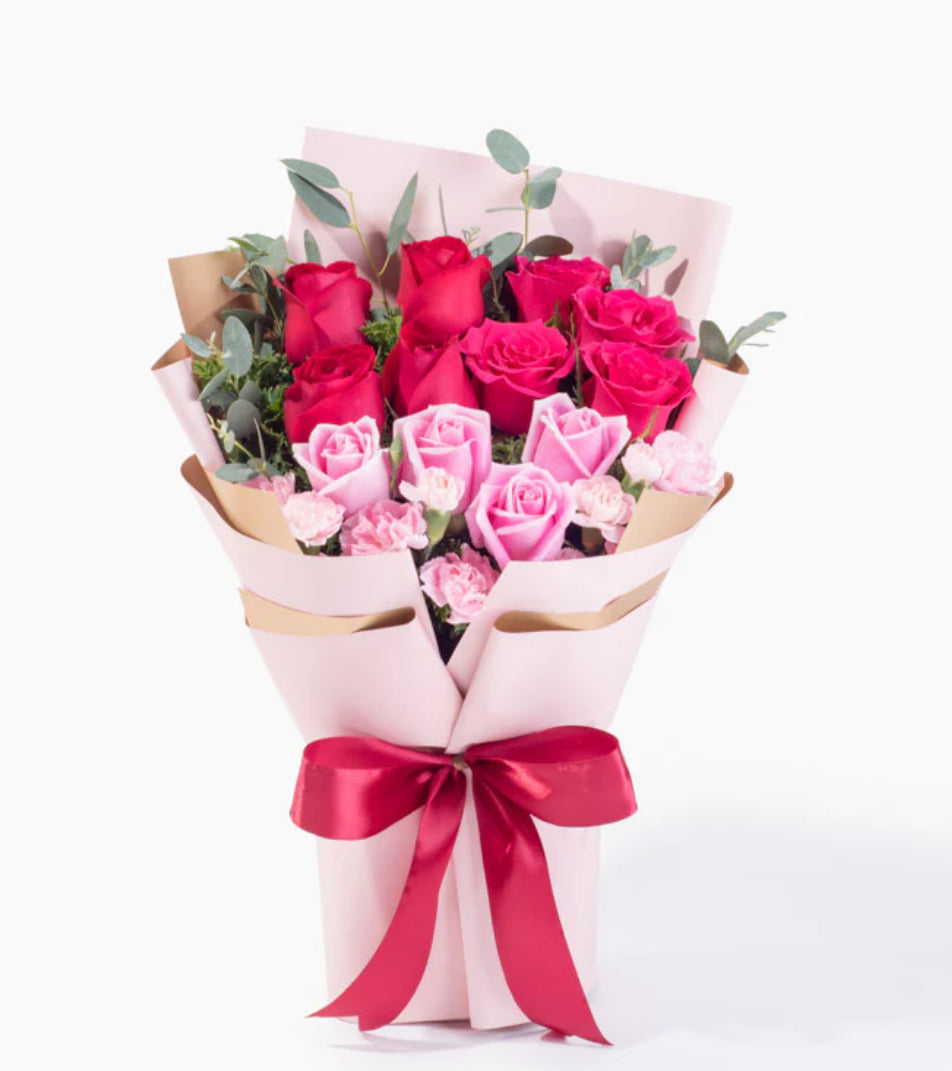 Red Roses (4 Stalks), Shocking Pink Roses (4 Stalks), Pink Roses (4 Stalks), and Carnation Spray Light Pink (2 Stalks)