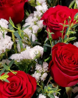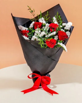 A symbol of love and admiration, Pure Romance speaks volumes without saying a word. Featuring 5 red roses that embody heartfelt devotion, paired with delicate white statice and lush parvifolia eucalyptus, this bouquet beautifully captures timeless affection with simple elegance.